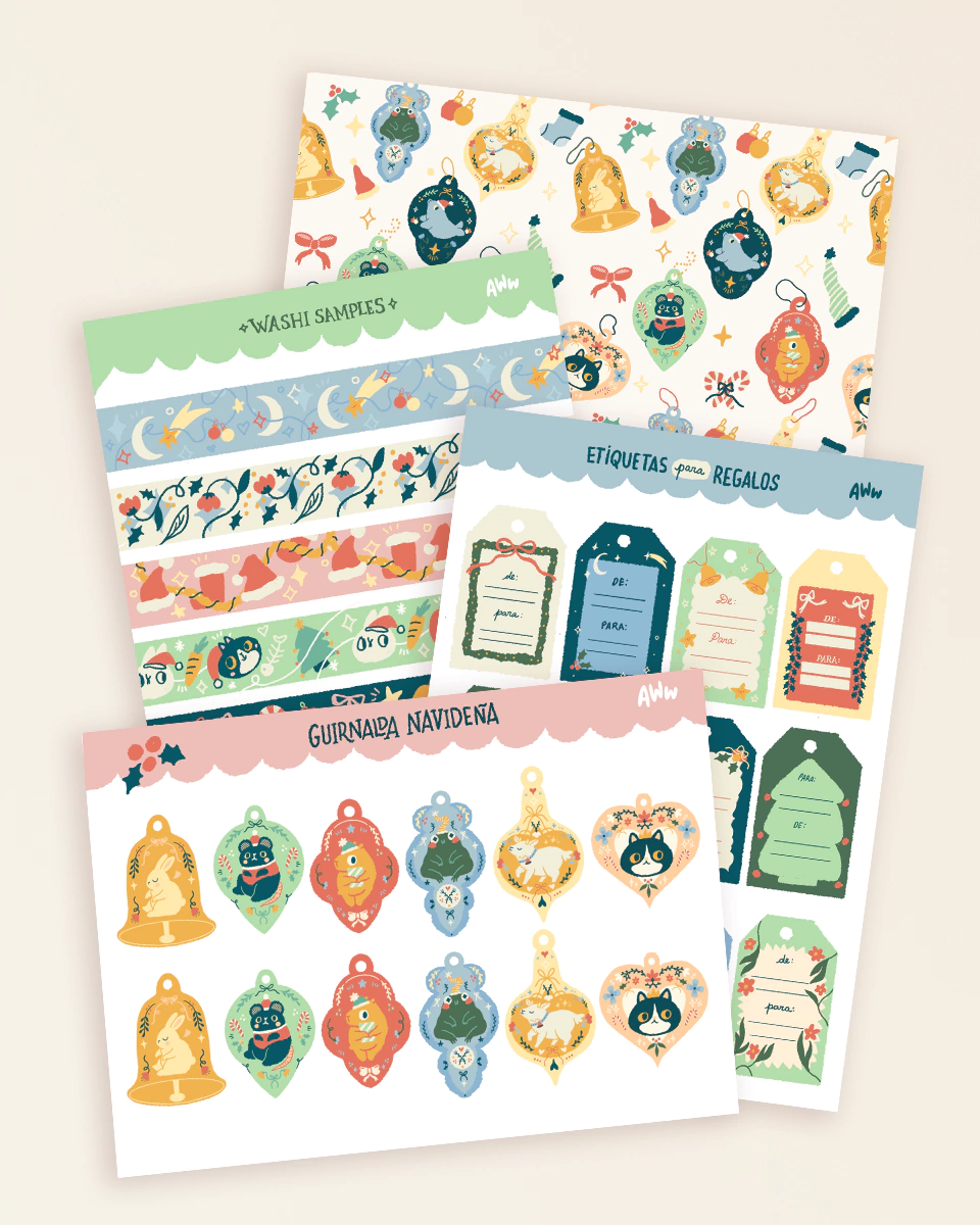 Un archivo digital tamaño A3 (42cm x 29,7cm) a 300dpi, en CMYK, en formato .jpg. Podés imprimirlo en tu casa o llevarlo a una casa de impresión. Recomiendo imprimir en papel fino, para que resulte más sencillo de plegar mientras envolves regalos (obra de 75g sería lo ideal). Si te resulta muy grande, también podés imprimirla en A4 que la calidad va a ser buenísima.