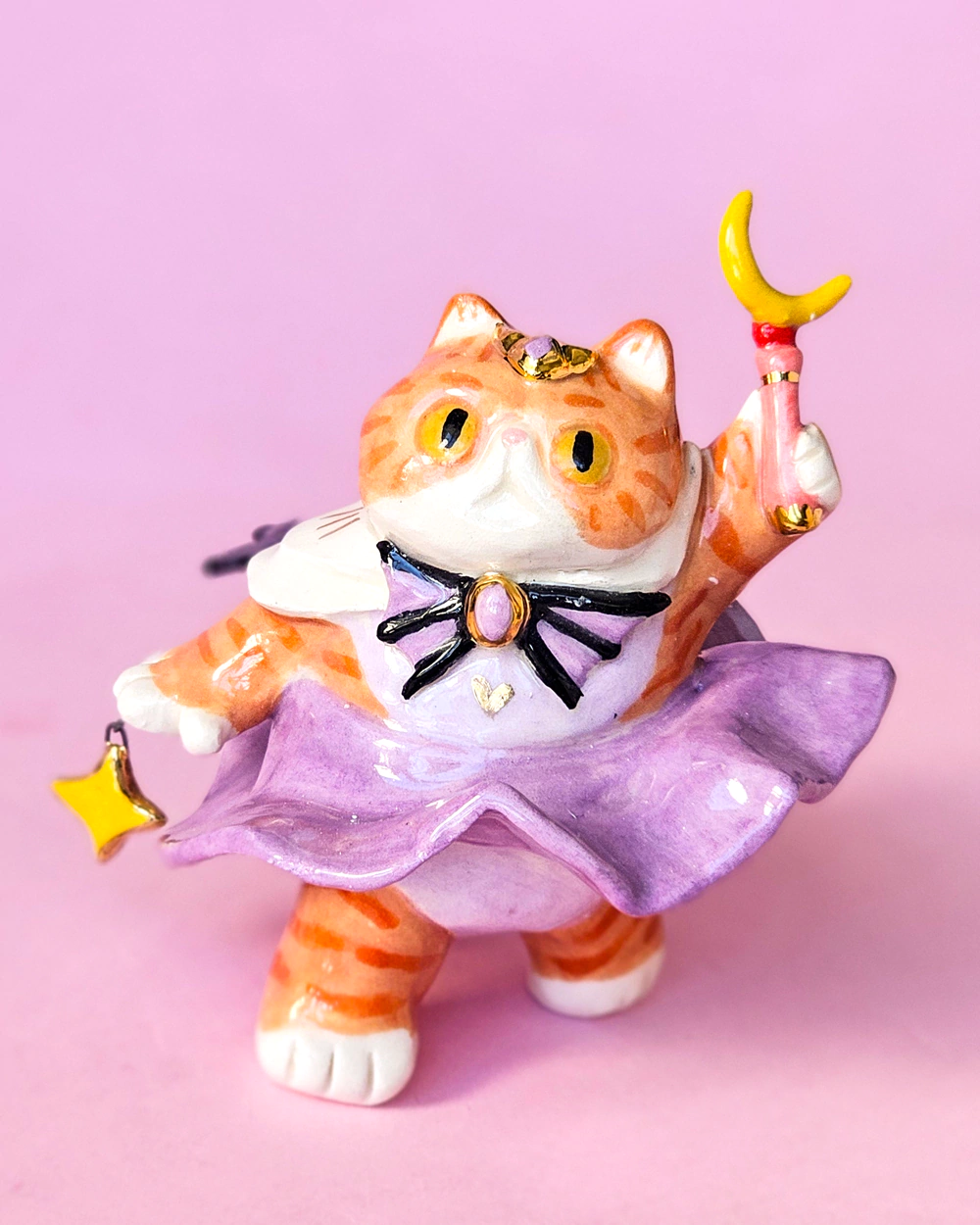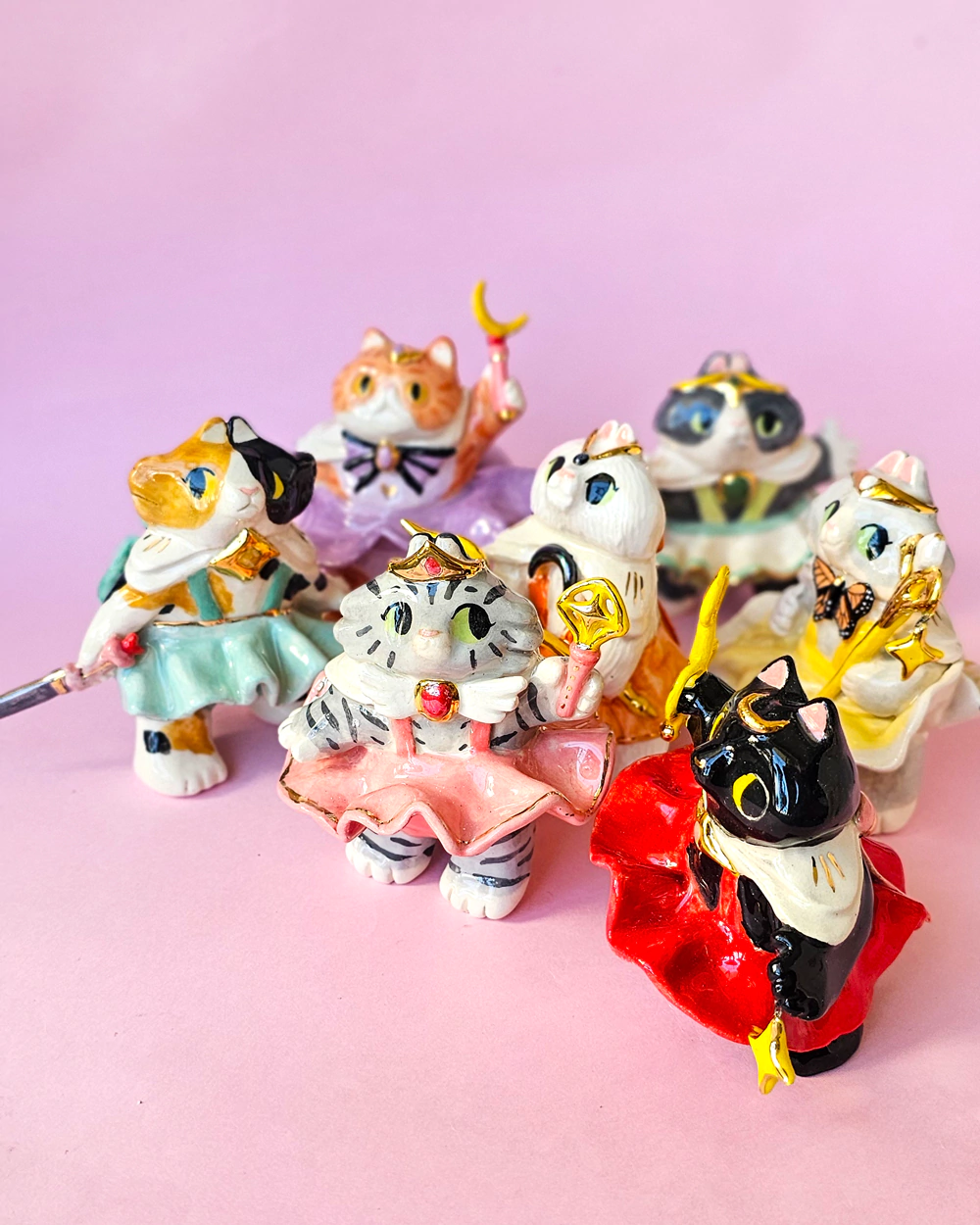 Siete piezas únicas que representan a siete piedras argentinas, estas guerreras gatunas vienen a proteger tu energía y a tu hogar. Miden aproximadamente 9cm de altura y tienen detalles en oro y nácar de tercer fuego.